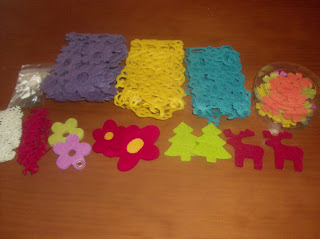 Estes trabalhos em cima são os que eu fiz, não tive muito tempo por isso caprichei um pouco mais nos materiais que enviei. Desde lantejoulas de várias formas e cores, materiais de feltro, apliques diversos guardanapos porque eu sei que ela faz decoupage, linhas e barras para ponto cruz ( o pano e o saco vermelho eu esqueci-me de por na caixa, desculpa Li), e claro alguns docinhos e o meu chá preferido para ela provar. Já sei que ela gostou de tudo, agora resta-me aguardar pela parte dela que vai chegar no final do mês.