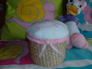 Eu tinha um cestinho muito sem graça, e quis fazer-lhe alguma coisa. Então bordei uma fada e apliquei, enchi com por dentro e ficou assim.